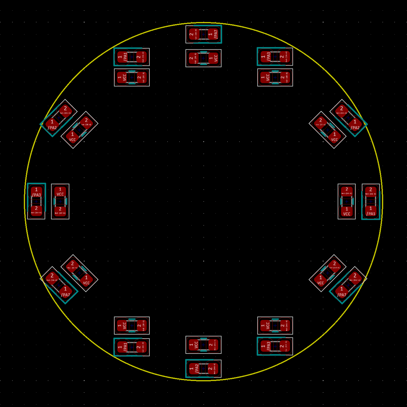 今回は円形基板上に12個ずつのLEDと抵抗を円形配置で並べるのが肝です。