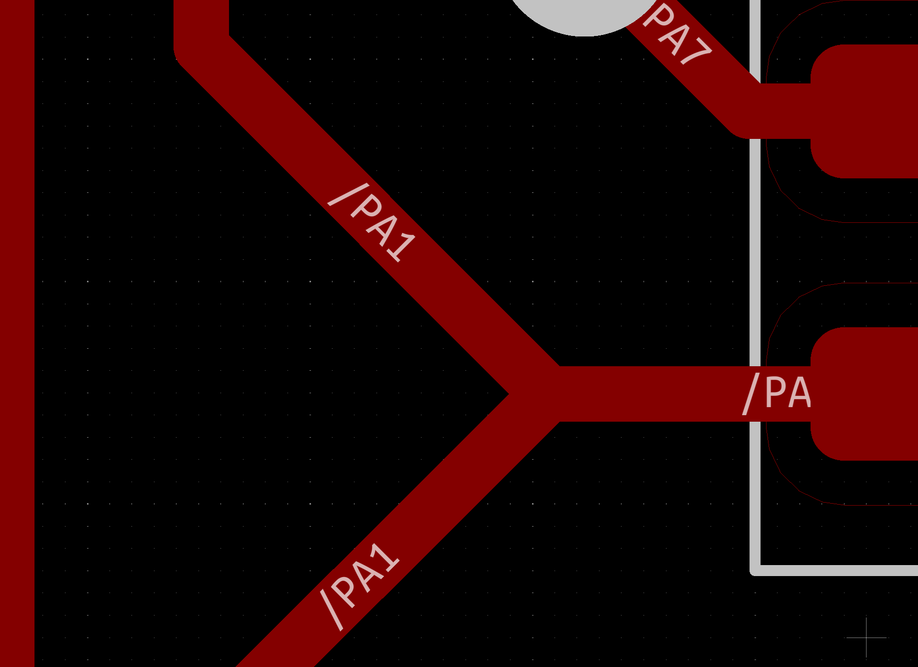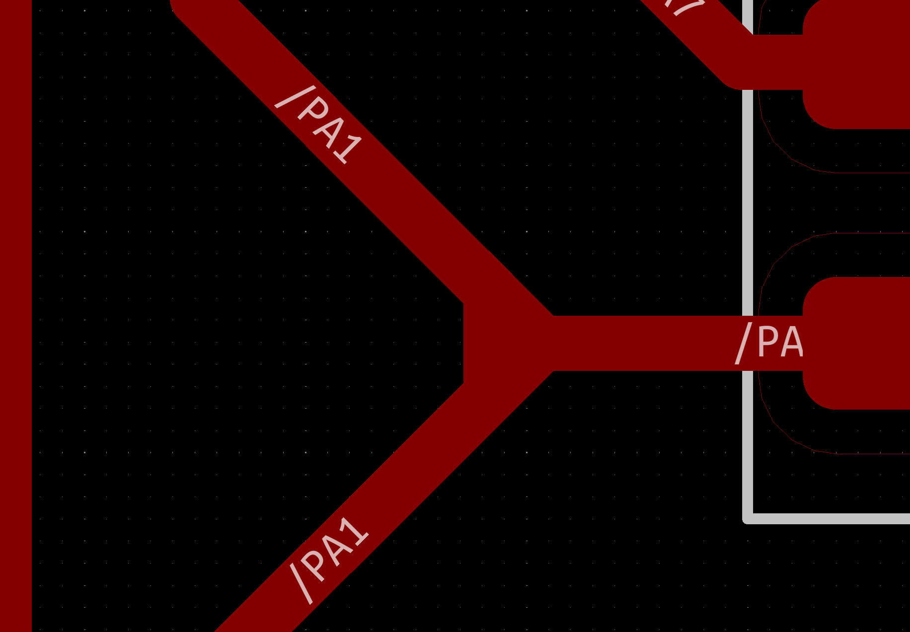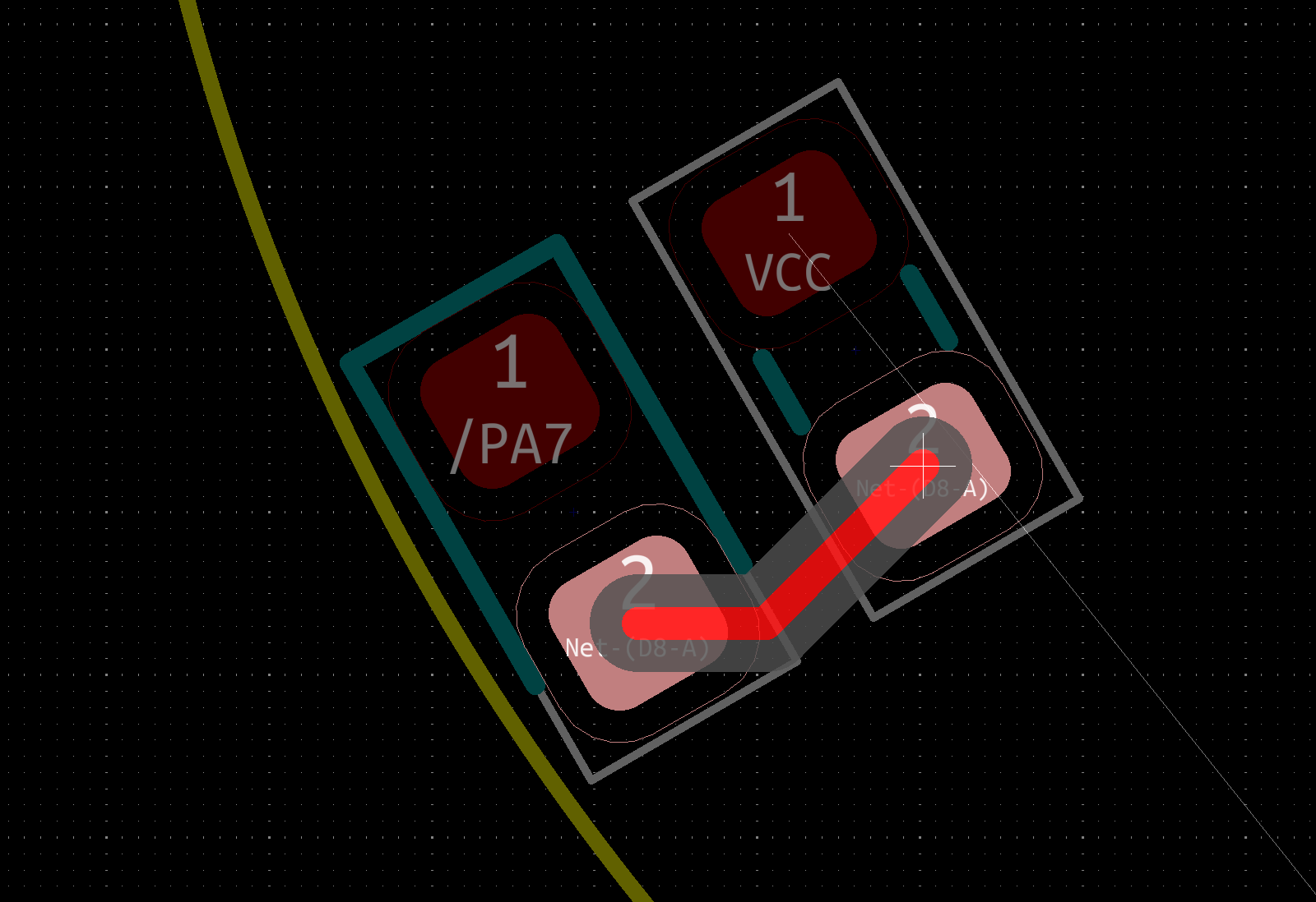 上の図くらいの距離の配線であればそれほど問題ありませんが、基板全体の配線をしていくと配線を曲げる回数が増えて手間です。